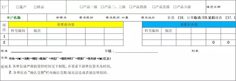 訂單變更單一般由銷售業(yè)務發(fā)起,PMC調(diào)查匯總;如果變更內(nèi)容在周計劃周期前,則需以補充計劃形式發(fā)布,如果在周計劃周期之后,則需更新SHIIPPING PLAN;訂單變更單模版,如下截圖4: