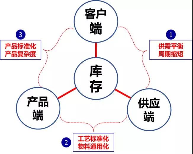 從企業(yè)的運營角度看,客戶、產(chǎn)品、供應(yīng)決定運營的復(fù)雜度,直至庫存的復(fù)雜度。舉例:保證供需平衡、縮短交付周期,可有效的降低安全庫存持有量;如產(chǎn)品和工藝設(shè)計通用化及標準后,產(chǎn)品生產(chǎn)難度就會降低,生產(chǎn)周期就縮短,相應(yīng)的庫存就下降。