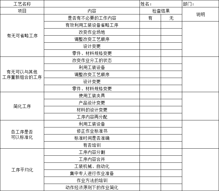 產(chǎn)品工藝分析檢查表將工作中可能涉及的問(wèn)題進(jìn)行了匯總,這樣大大簡(jiǎn)化了思考過(guò)程,使分析過(guò)程變得更直觀、更簡(jiǎn)便。產(chǎn)品工藝分析的內(nèi)容可以根據(jù)分析者的需要自行設(shè)計(jì),如表所示: