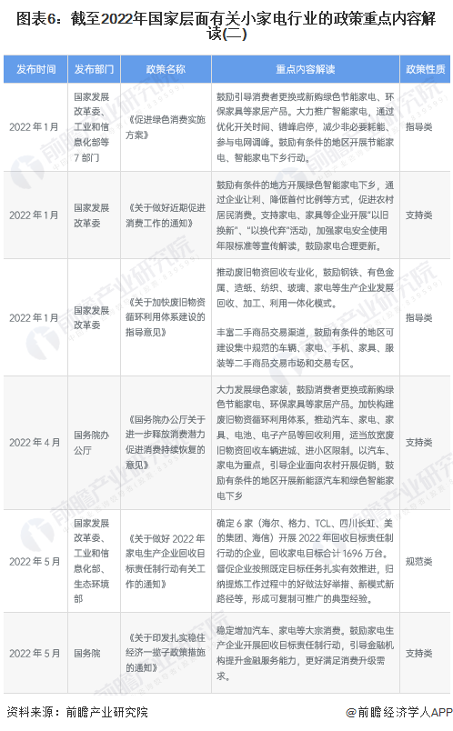2022年1月,國家發(fā)改委擬定《關(guān)于做好近期促進消費工作的通知》,鼓勵有條件的地方開展綠色智能家電下鄉(xiāng),通過企業(yè)讓利、降低首付比例等方式,促進農(nóng)村居民消費。支持家電、家具等企業(yè)開展“以舊換新”、“以換代棄”活動,加強家電安全使用年限標準等宣傳解讀,鼓勵家電合理更新。2022年一季度,中國境內(nèi)零星爆發(fā)新型冠狀肺炎疫情導(dǎo)致經(jīng)濟增長受阻,國務(wù)院也于2022年5月制定了一攬子穩(wěn)住經(jīng)濟的政策措施,其中提及穩(wěn)定家電產(chǎn)品的消費??偨Y(jié)梳理來看,近年來國家層面對于小家電行業(yè)的政策關(guān)鍵詞在于:新一輪家電下鄉(xiāng)、以舊換新、補貼消費、家電回收。