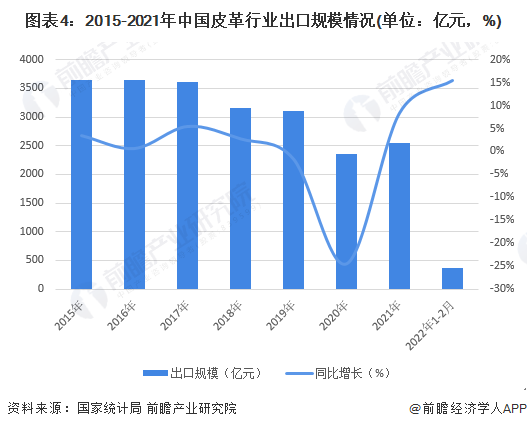我國是全球皮革制造行業(yè)主要的生產(chǎn)地和出口地,2015-2018年,全國皮革出口規(guī)模逐年增長;2019年受到中美貿(mào)易摩擦的影響,有小幅下降;2020年受新冠疫情的影響,全國皮革行業(yè)出口總額同比下降超過20%;2021年皮革出口市場逐漸回溫,全年皮革產(chǎn)品出口總額超過2500億元,同比增長超過8%。